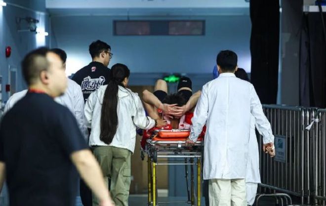郭艾伦倒在地上,一边捂着膝盖,一边流下眼泪,还用手拍击地板,确实是很难受。此时广州龙狮男篮的球员和教练都围上来了,还叫了医护人员上场。最终,郭艾伦被队友抬上了担架床,被医护人员推出场,提前退赛。